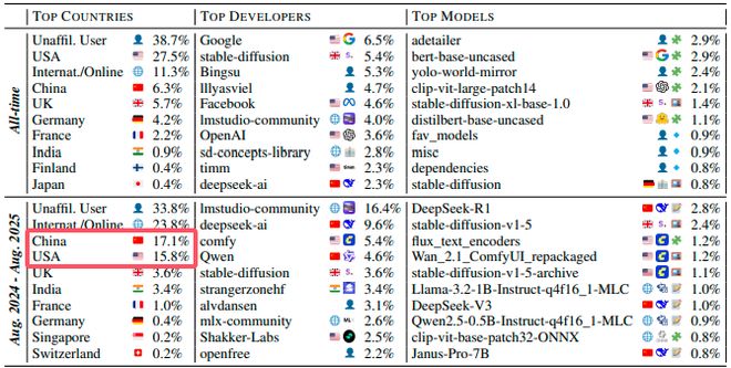 报告显示,过去一年,中国团队自主研发的开源AI模型下载份额占比已上升至17.1%,首次超过美国同行,后者的下载份额占比为15.8%。