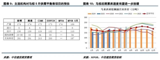 然而,短期棕榈油涨势受到马棕5月进一步累库的制约。尽管马棕5月阶段性产量增幅持续缩窄,在上月高基数的产量下,目前主流机构预估的马棕5月产量仍高达174万吨左右,即便出口环比大幅增长至130万吨附近,马棕5月末库存仍有望攀升至200万吨以上,这对MPOB月报前的棕榈油走势带来打压。不过,在国际豆棕价差修复,且印度植物油补库有望提振产地出口的背景下,我们预计马棕后期累库速度将进一步放缓,这将限制棕榈油价格在当前位置的进一步下跌幅度。