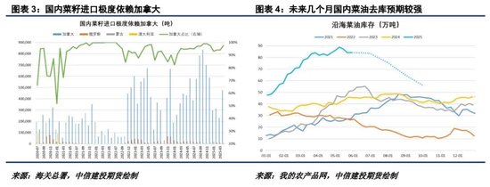 6月10日即将实施的保税区监管新规引发近期企业洗船,根据我们的了解, 6月后国内菜籽到港仅剩零星几条。在此背景下,即便中加关系能在后期获得实质性改善,在2025/26年度加菜籽新作上市供应前,我们预计国内菜籽供应也较难获得明显改善。加菜籽新作在8-9月收割后,运到中国并通关压榨,至少也得到10月。在当前俄罗斯菜油也已进入出口季末的情况下,未来几个月国内菜油去库的倾向依然较强。随着菜油市场担忧情绪释放,这预计将逐步对菜油期价带来支撑,关注菜油09合约在9000附近的支撑表现。